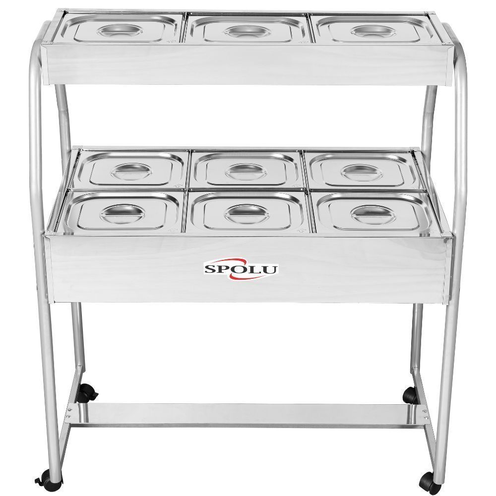 Buffet Combinado 6 Cubas Quente e 3 Cubas Frias SPL506CO Spolu. Ideal para restaurantes, buffets, cozinhas industriais e similares. Fabricado com estrutura externa em aço inox 430 e cubas em inox 201, oferece durabilidade, higiene e excelente desempenho no uso contínuo. Possui 6 cubas quentes com resistência blindada em inox, controladas por termostato com faixa de 30°C a 120°C, e lâmpada piloto indicando o funcionamento. As 3 cubas frias utilizam GELO X, mantendo alimentos refrigerados durante toda a exposição. A estrutura tubular conta com rodízios giratórios, facilitando o transporte e posicionamento do equipamento. CAPACIDADE: Cubas quentes 6L cada/Cubas frias 4,5L cada. TEMPERATURA: 30°C a 120°C. POTÊNCIA: 2.500W. CONSUMO: 1,9kW/h. PESO: 24,6kg. DIMENSÕES(CxAxL): 110,5x136x58cm. Buffet Combinado 6 Cubas Quente e 3 Cubas Frias SPL506CO Spolu é na Atau.