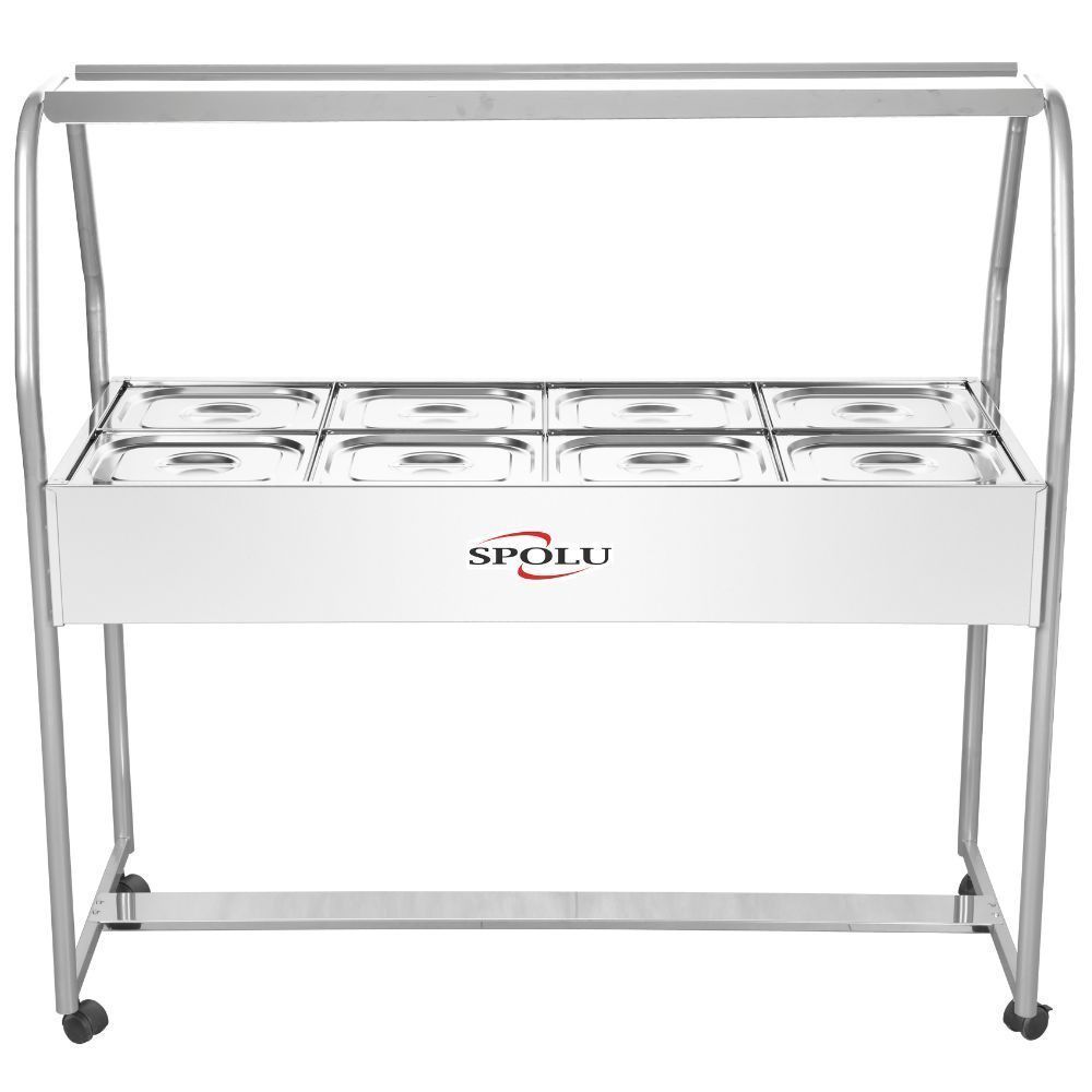 Buffet Térmico 8 Cubas SPL508 Spolu. Ideal para buffets, restaurantes, hotéis, refeitórios e similares. Produto de desenvolvido para manter os alimentos na temperatura ideal durante sua exposição e serviço, combinando estrutura reforçada com acabamento em inox e pintura resistente. Possui cubas fabricadas em aço inox 201, tanque, tampas e moldura externa em aço inox 430. Sua resistência blindada é confeccionada em aço inox e controlada por um termostato com escala de 30ºC a 120ºC. Possui uma lâmpada piloto em seu painel indicando a função liga/desliga. Para facilitar a movimentação e o deslocamento a estrutura tubular é dotada de rodízios giratórios. CAPACIDADE DAS CUBAS: 8 cubas de 6 litros cada. POTÊNCIA: 2.500W. CONSUMO: 1,9kW/h. TEMPERATURA AJUSTÁVEL: 30 a 120°C. PESO: 24,9kg. DIMENSÕES(CxAxL): 144x136x58cm. Buffet Térmico 8 Cubas SPL508 Spolu é na Atau.