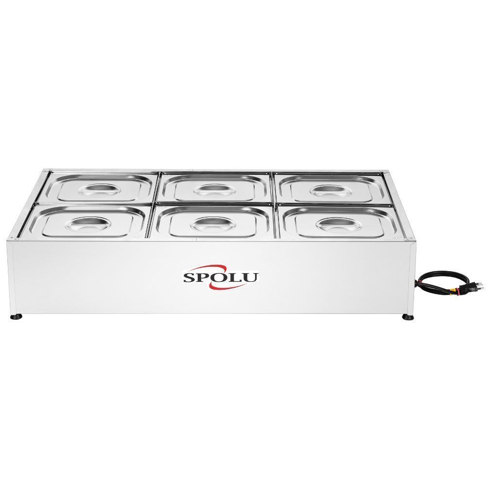 Buffet Térmico de Bancada 6 Cubas SPL506BC Spolu. Ideal para restaurantes, buffets, cafeterias, cozinhas industriais e similares. Sua função é manter os alimentos aquecidos enquanto estão em exposição, oferecendo praticidade e eficiência no serviço. Possui cubas em aço inox 201, além de tanque, tampas e moldura externa em inox 430, garantindo durabilidade e higiene no uso diário. A resistência blindada, confeccionada em aço inox, é controlada por termostato com escala de 30°C a 120°C, acompanhada de lâmpada piloto no painel que indica o estado liga/desliga. A estrutura é compacta e robusta, com fácil manuseio e instalação em bancadas. CAPACIDADE: 6L cada cuba. CONSUMO: 1,9kW/h. TEMPERATURA: 30°C a 120°C. POTÊNCIA: 2.500W. PESO: 14,8kg. DIMENSÕES(CxAxL): 110x22,5x58cm. Buffet Térmico de Bancada 6 Cubas SPL506BC Spolu é na Atau.