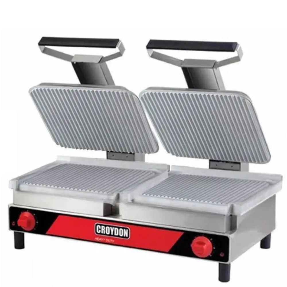 Sanduicheira Dupla Elétrica Estriada com Prensa SADE Croydon. Ideal para restaurantes, lanchonetes, bares e similares. Possui duas placas estriadas de alumínio fundido. Atenção: Equipamento fornecido sem plug. CAPACIDADE NOMINAL: 18 Sanduíches. POTÊNCIA(110V): 3100W. POTÊNCIA(220V): 5000W. CONSUMO(110V): 1,6kWh. CONSUMO(220V): 2,5kWh. CORRENTE(110V): 24,4A. CORRENTE(220V): 22,7A. ÁREA ÚTIL: 2x 31x33,5cm (Aprox.). PESO: 25,2kg. DIMENSÕES (CxAxL): 71x37x51cm. Chapa Sanduicheira Dupla Elétrica Estriada com Prensa SADE Croydon é na Atau.