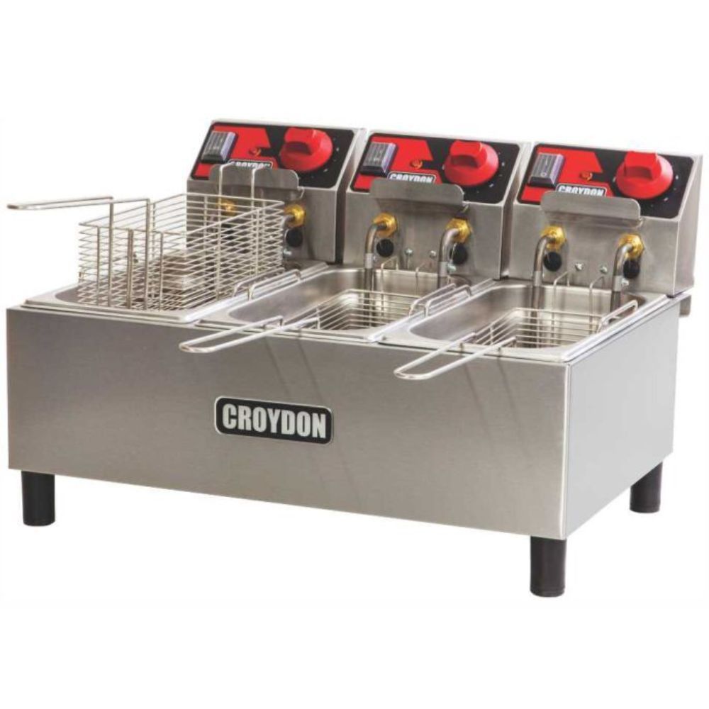 Fritadeira Elétrica 9 Litros 3 Cestos FC3A Croydon. Ideal para lanchonetes, padarias, restaurantes e similares. Equipamento robusto com três cubas independentes, proporcionando versatilidade, permitindo preparar três diferentes itens simultaneamente, sem misturar sabores, além de fácil limpeza e manutenção. Estrutura em aço inox, cuba resistente e cesto de fritura prático. CUBAS: 3 GN 1/3. CAPACIDADE DE ÓLEO: 3x3l. PRODUÇÃO MÁXIMA: 36kg/h. POTÊNCIA: 3x1600W. CORRENTE: 3x12,6A. CONSUMO: 3x0,8kWh. PESO BRUTO: 11,5kg. DIMENSÕES(CxAxL): 45x34x54cm. Fritadeira Elétrica 9 Litros 3 Cestos FC3A Croydon é na Atau.