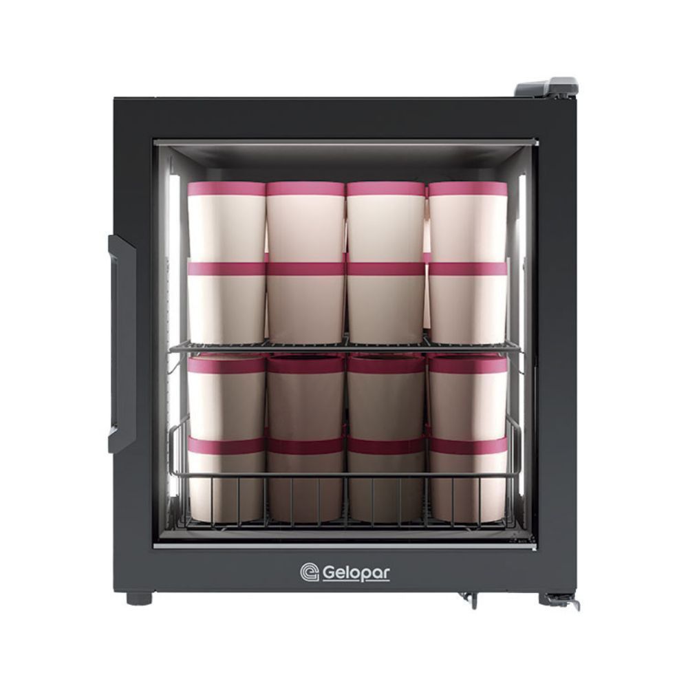 Refrigerador Bancada 85L GFB75CB Gelopar. Ideal para bares, lanchonetes, padarias, cafeterias e similares. Conservação e exposição de produtos congelados e resfriados. Temperatura: Congelados -15° a -20°C/ Resfriados 0° a +7°C. Refrigeração: Estática com serpentina. Degelo: Manual. Controle de Temperatura: Termostato eletrônico. Iluminação interna LED. Porta de vidro triplo temperado baixo emissivo, com sistema de aquecimento, serigrafia e perfil slim. Prateleiras aramadas: 1 nível + cesto aramado. Revestimento: Interno e externo em aço pré-pintado preto. Vidros sujeitos a condensação da umidade do ar. PORTAS: 1. FREQUÊNCIA: 50/60Hz. CAPACIDADE: 85 litros. CONSUMO: 4,96kWh/dia. PESO: 38,5kg. DIMENSÕES(CxAxP): 55x62x63,5cm. Equipamento certificado conforme Portaria Inmetro nº 148/2022. Refrigerador Bancada 85L GFB75CB Gelopar é na Atau.